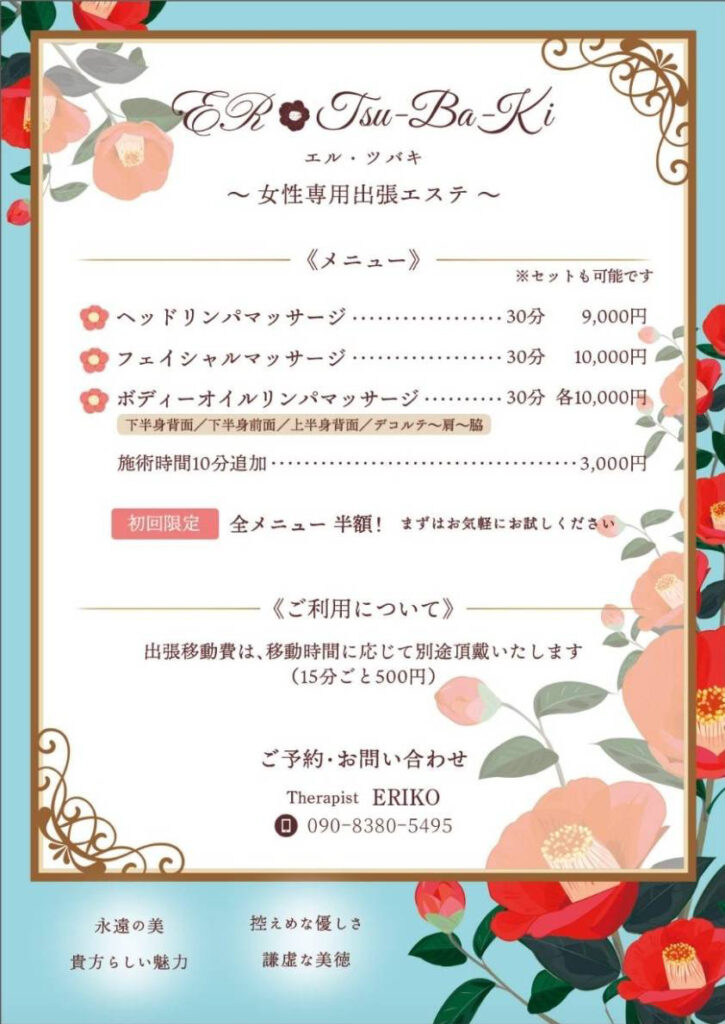 女性専用の出張エステサロン ER.Tsu-Ba-Ki(エル・ツバキ)